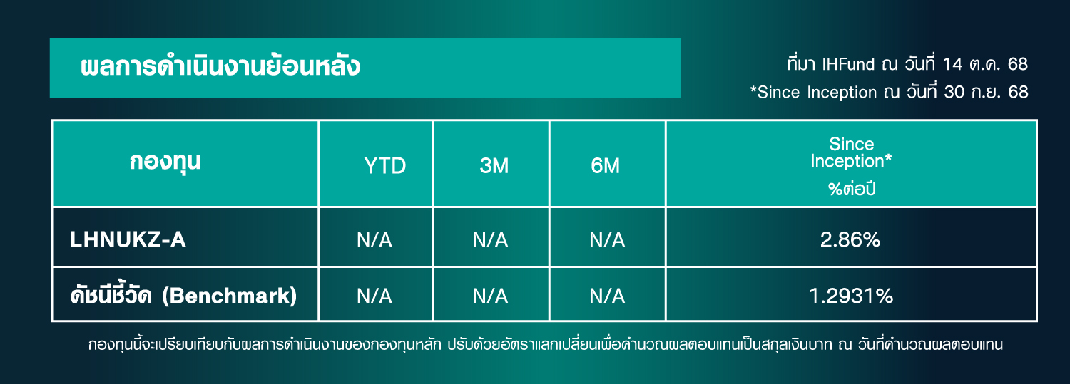 ควรจัดสรรกองทุน LHNUKZ เป็น ส่วนเสริมพอร์ต (Satellite) ในสัดส่วนที่ไม่สูงมากนัก เช่น 10-20% ของพอร์ตทั้งหมด และใช้วิธี ทยอยลงทุนอย่างสม่ำเสมอ (Dollar-Cost Averaging - DCA) เป็นรายเดือน เพื่อลดความเสี่ยงจากการเข้าลงทุนผิดจังหวะและช่วยเฉลี่ยต้นทุนในภาวะที่ตลาดมีความผันผวน