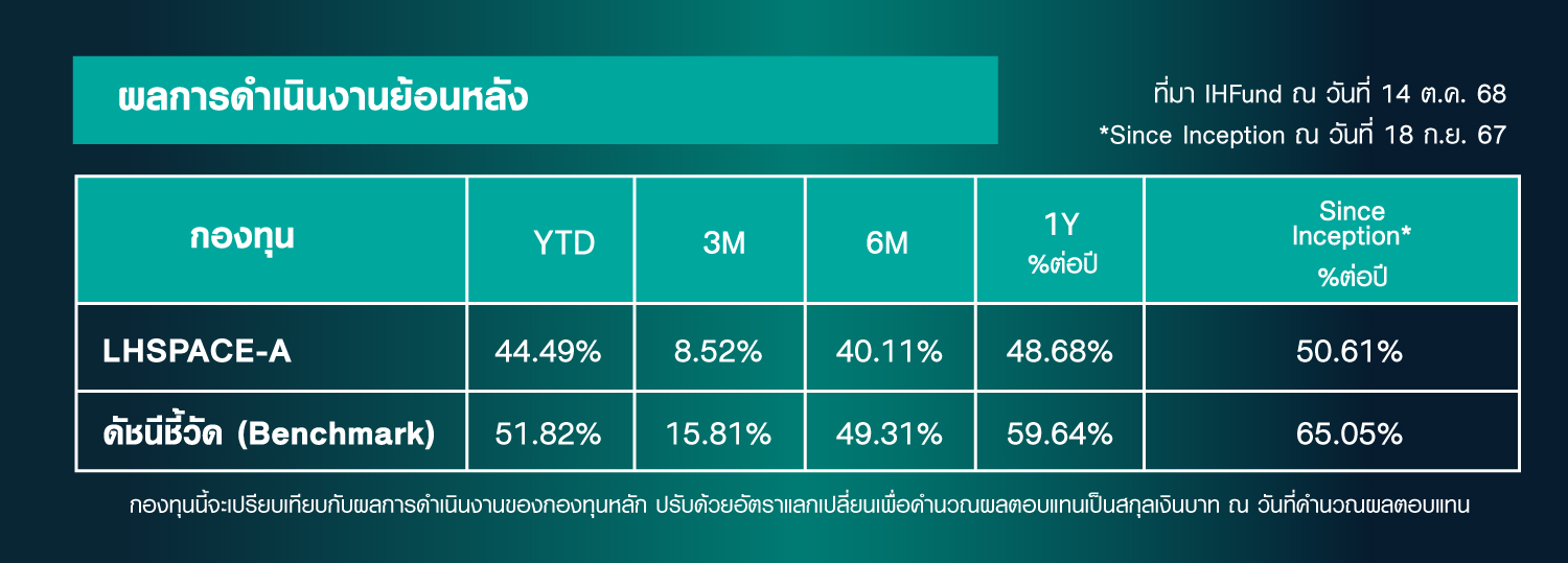 กองทุน Neuberger Berman Next Generation Space Economy Fund (กองทุนหลักของ LHSPACE) สร้าง ผลตอบแทนย้อนหลัง 1 ปี อยู่ที่ +56.05% เทียบกับดัชนีชี้วัด MSCI ACWI ที่ +18.41% (ข้อมูล ณ 18 ก.ย. 2025) โดยปัจจัยหนุนหลักยังคงเป็นแรงขับเคลื่อนจากนวัตกรรมของภาคเอกชนและการลงทุนจากภาครัฐทั่วโลก