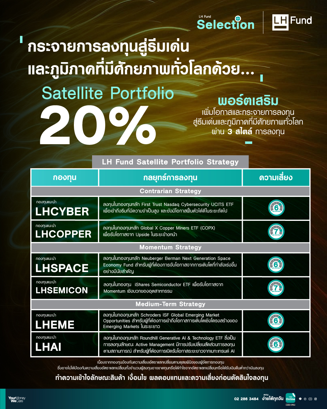 • ภายใต้บริบทดังกล่าว กลยุทธ์การลงทุนของ LH Fund ยังคงเน้นการจัดพอร์ตแบบสมดุล โดยแบ่งเป็น Core Portfolio และ Satellite Portfolio
