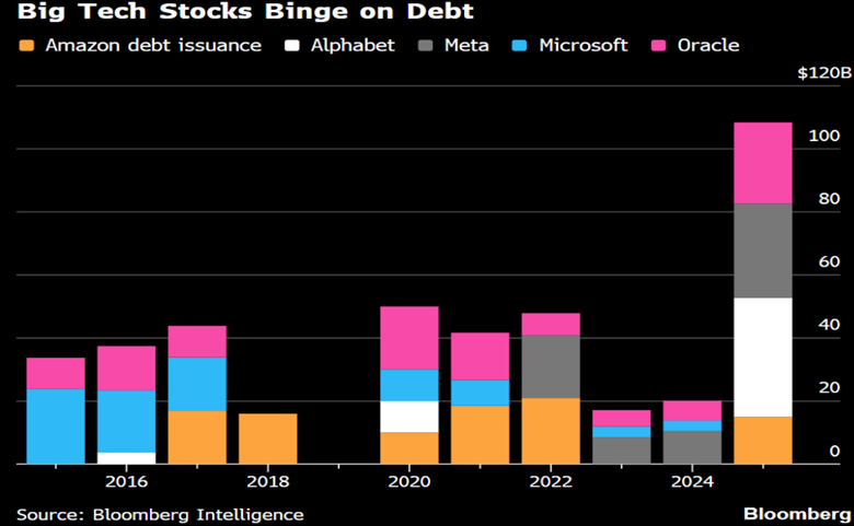 ความกังวลนี้ยังสะท้อนผ่านตลาดตราสารหนี้ โดยเฉพาะค่า Credit Default Swap (CDS) ที่ปรับตัวสูงขึ้นจาก 104 ในเดือน พ.ย. 2025 ซึ่งนักลงทุนกังวลว่าหากธนาคารกลางสหรัฐฯ (FED) ชะลอการปรับลดอัตราดอกเบี้ยจะส่งผลกระทบต่อบริษัทกลุ่ม AI ที่มีการกู้ยืมเพิ่มขึ้นเพื่อลงทุนในโครงสร้างพื้นฐาน AI ซึ่งอาจส่งผลลบต่อกำไรและราคาหุ้นได้