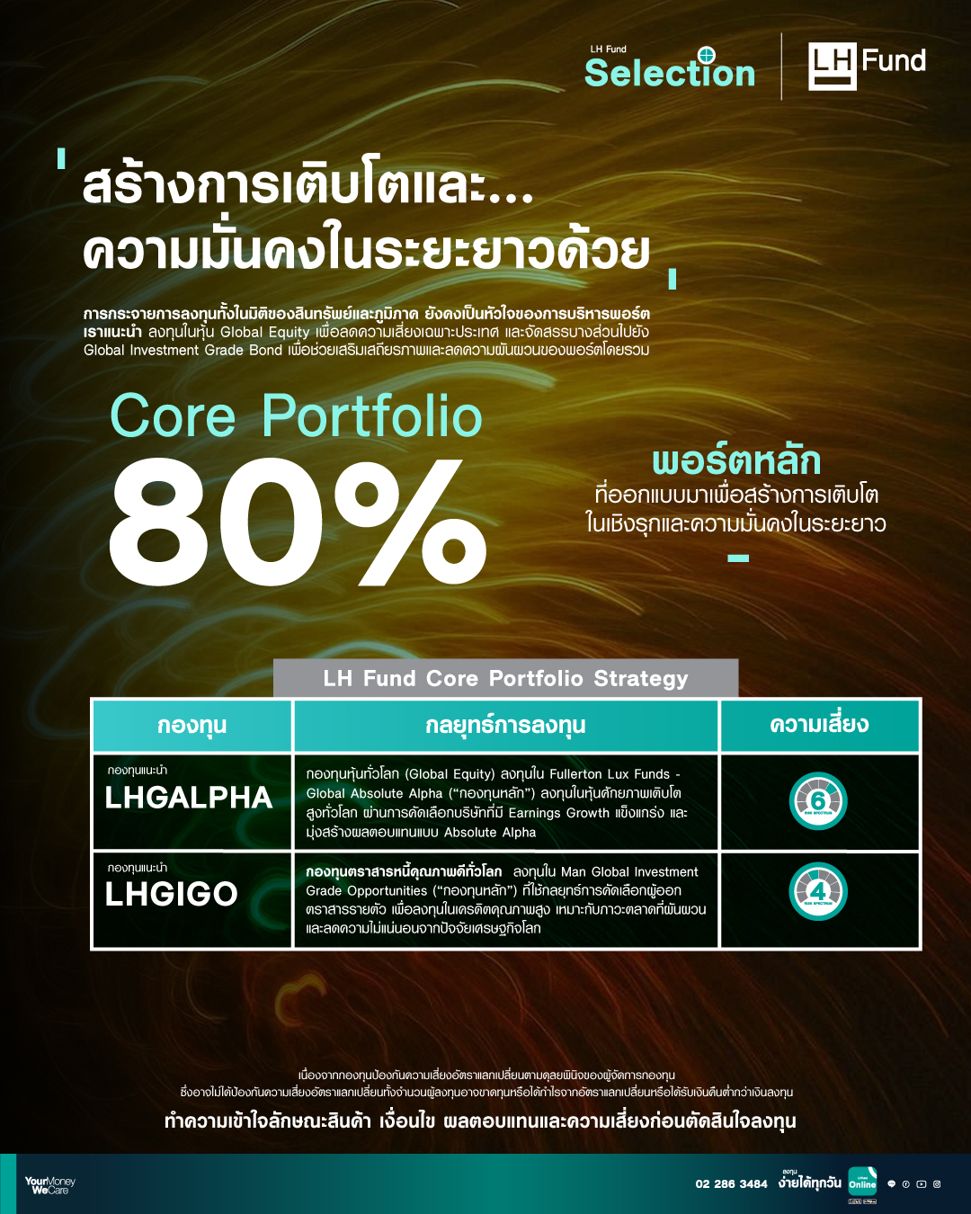 • ภายใต้บริบทดังกล่าว กลยุทธ์การลงทุนของ LH Fund ยังคงเน้นการจัดพอร์ตแบบสมดุล โดยแบ่งเป็น Core Portfolio และ Satellite Portfolio
